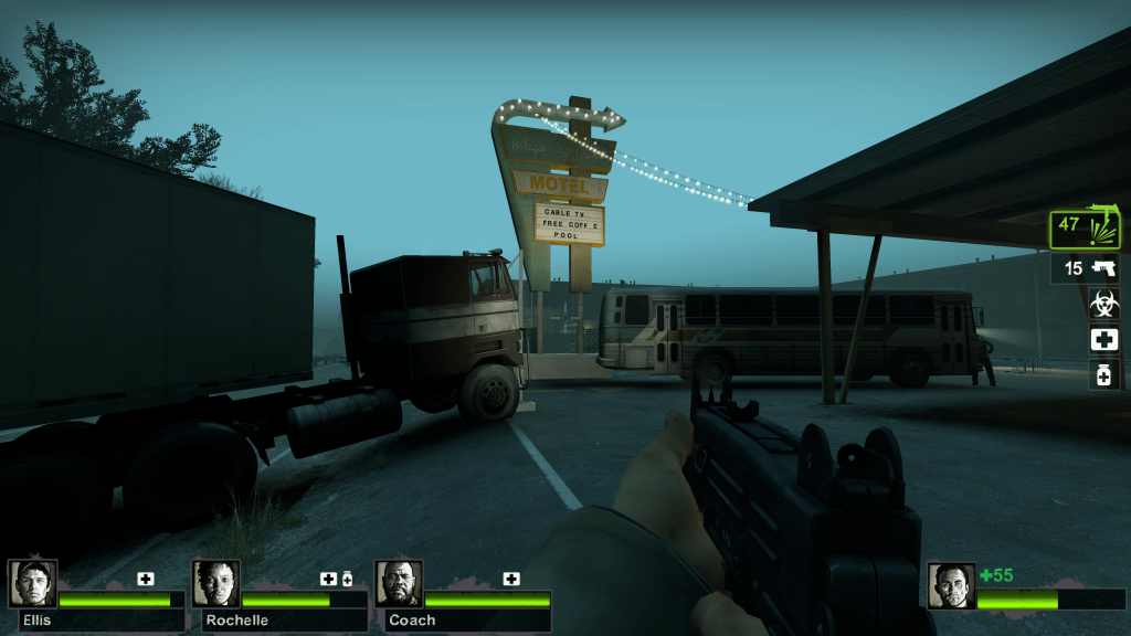 Left 4 Dead was published on November 17, 2008, by American developer Valve Corporation. The sequel, Left 4 Dead 2, was released exactly one year later due to the first game’s immense popularity.[1] Inspired by horror film aesthetics and narrative techniques, both games throw the player and up to three other players into a virus-induced zombie apocalypse in a first-person shooter game with semi-realistic graphics. The player(s) take on the role of the only survivors of the apocalypse and fight their way through motels, sugar mills, subway stations, and more, armed with any weapons they can find along the way. Within the game’s universe, survival is the primary objective with little-to-no thought given to the long-term future of the world. The games take place in twenty-first century United States with the characters fighting through familiar-looking streets and buildings of our modern-day cities, only devastated by the apocalypse. Both Left 4 Dead games have four different main playable protagonists, each with their own backstory that they share bits and pieces of during the quieter moments of the game.