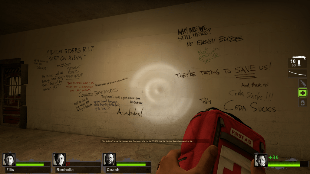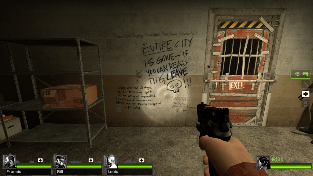 Since neither of the Left 4 Dead games provide the player with much background lore beyond the game’s general premise prior to starting a level, the majority of universe lore is either banter between the survivors or messages left behind in the graffiti. Because the graffiti is lasting, the conversations from past days, weeks, months, or even years are preserved not just for other survivors, but also for the writers themselves. By “defacing” a wall, one is permanently leaving their mark on the world, ensuring that even zombification cannot totally erase the humans they once were. Even if traditional means of recordkeeping are largely defunct, the graffiti is a record that this individual existed and that they did not go down without a fight, nor did they choose to die in anonymity. Though they may never actually meet the future readers of their messages, they know that, eventually, someday someone will read it and know them. Because of the accessibility of contributing to these graffiti “archives,” should society survive past a zombie apocalypse, individuals will be remembered more than institutions, laying the brickwork for a genuine “people’s” history.