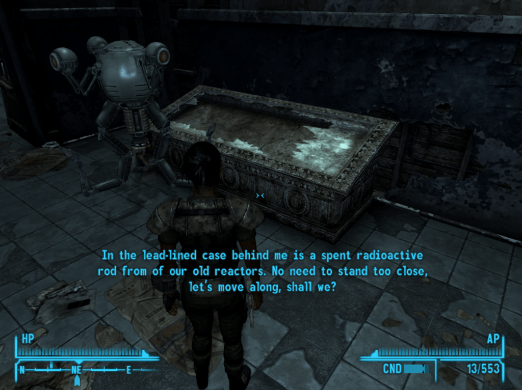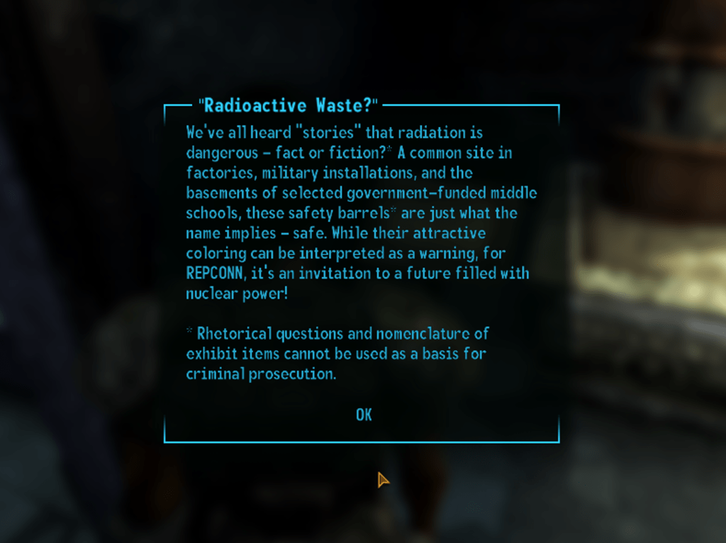 In New Vegas, since the imminent threat of extinction has mostly passed, archives have gained some level of formality again, though this is still far from our real-life systems and repositories. In the Mojave Wasteland, there are a few dedicated museums, such as that in the “Boomer” isolationist faction, located in the ruins of what was once Nellis Air Force Base. The Boomer museum relies on oral history rather than formal preservation of materials. The museum is a rarity, however, as most of the game’s museums are surviving relics from the old world. To in-game characters, these museums (usually associated with pre-war corporations) are little more than buildings to loot or in which to take shelter. To the player, these old-world relics also serve as a tongue-in-cheek warning of how our world can easily become the world of Fallout: New Vegas.