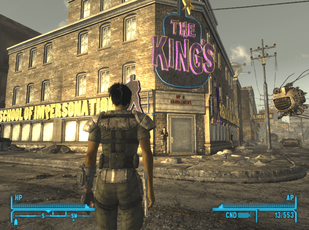 However, this very same absence of information also leads to humorously incorrect, albeit largely harmless, inferences about the pre-war Mojave. For example, one of the gangs of New Vegas, known as “the Kings,” base themselves on the appearance and lifestyle of a man they view to be an old-world monarch, due to the fact that they know him only as “the King.” Players recognize that this is obviously Elvis Presley, though no one in the universe is the wiser.