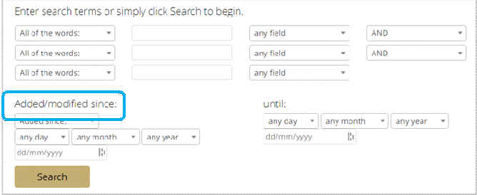 The Advanced Search guides users in creating more sophisticated queries. One feature that we at the Ford Foundation find of questionable value is the “Added/modified since” field. Because our repository contains thousands of documents migrated from other systems, the “Added/modified since” date (Figure 2) is the date of the migration—not the actual publication date of the record. Users can use the basic search field for date searches, but they must be aware of TIND search syntax to do so. For example, a search for year:1974 will yield results for documents with 1974 in the publication date field. TIND search syntax is well documented but not completely intuitive to the casual user.