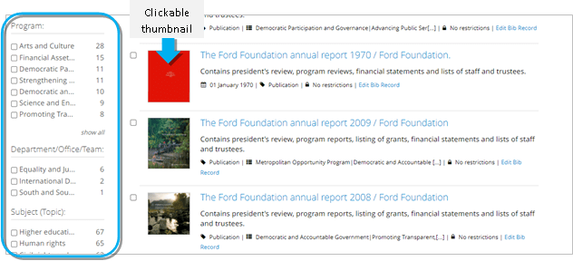 TIND offers other robust features for Filtering and Sorting to help narrow down a results set. Figure 3 shows how the foundation uses facets (populated with terms from our ontology) to help users narrow search results by selecting one or more terms organized into broad categories. Facet terms are displayed in order of frequency so users will see the most relevant terms at the top of the list. Because the filter panels can display only up to 500 values, we typically advise our users to add terms to their search queries rather than browse for them in the side panels, which can be unwieldy.