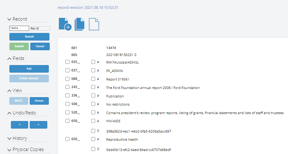 Figure 7. TIND IR Record Editor (Source: Ford Foundation’s institutional repository)