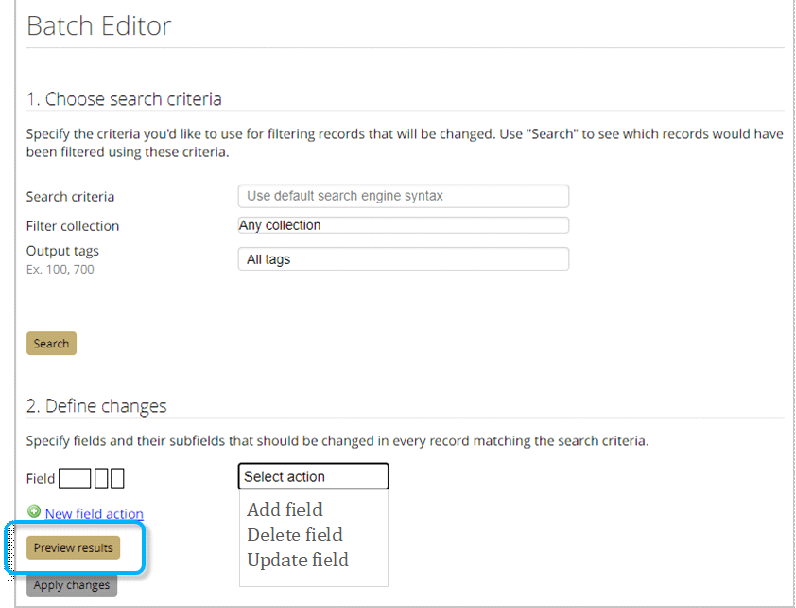 While the Record Editor (Figure 7) enables an administrator to update a single bibliographic record, the powerful Batch Editor (Figure 8) enables administrators to add, delete, or update metadata fields and to preview any changes before submitting them. This allows administrators to make bulk edits to metadata values, changing thousands of records in a matter of seconds. The preview feature means that administrators can get a glimpse of the proposed changes before executing them. The TIND interface highlights these changes so they are easy to spot and quantifies how many records and MARC fields will be affected by the change. Another advantage is that the Batch Editor allows administrators to select which MARC fields to include, so that the metadata preview isn’t overloaded with unnecessary values, but rather streamlined to emphasize the relevant fields.