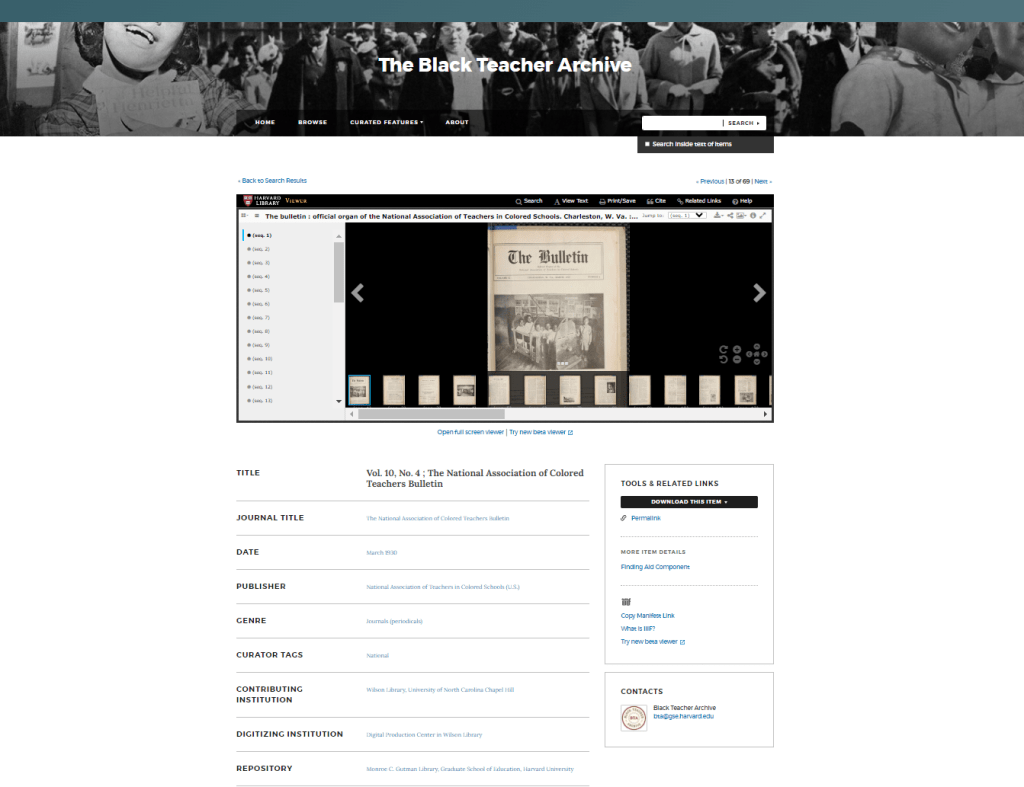 The Black Teacher Archive (BTA) is a newly developed digital resource from the Harvard Graduate School of Education and the Monroe C. Gutman Library Special Collections that offers access to serial publications and other materials from the Colored Teachers Associations (CTAs). With funding from the Andrew W. Mellon Foundation and the Spencer Foundation, a team of archivists, librarians, curators, and scholars collaborated to bring this project to fruition.