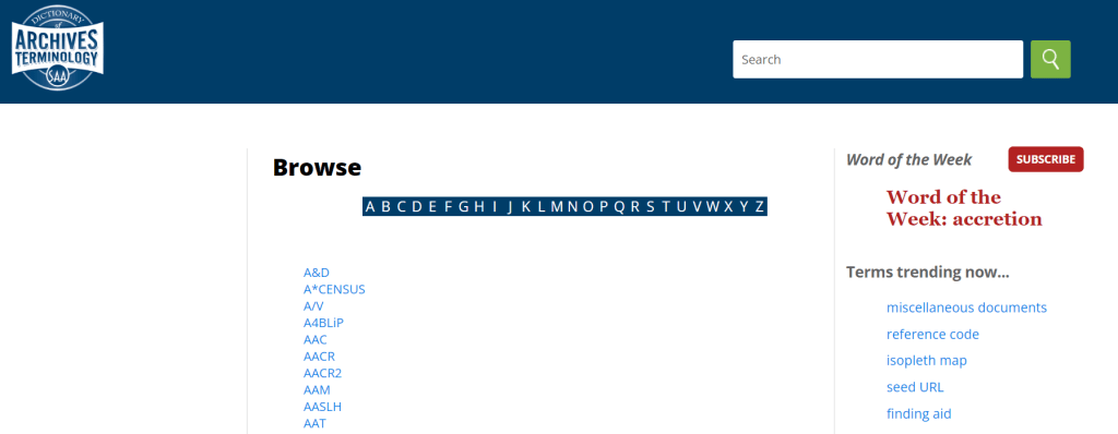 [2] Society of American Archivists, “Word of the Week,” https://www2.archivists.org/word-of-the-week.