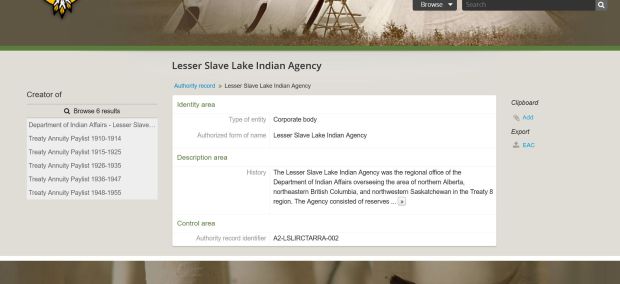 Figure 3. Lesser Slave Lake Indian Agency authority record, https://lslirc-tarrarchives.accesstomemory.org/lesser-slave-lake-indian-agency